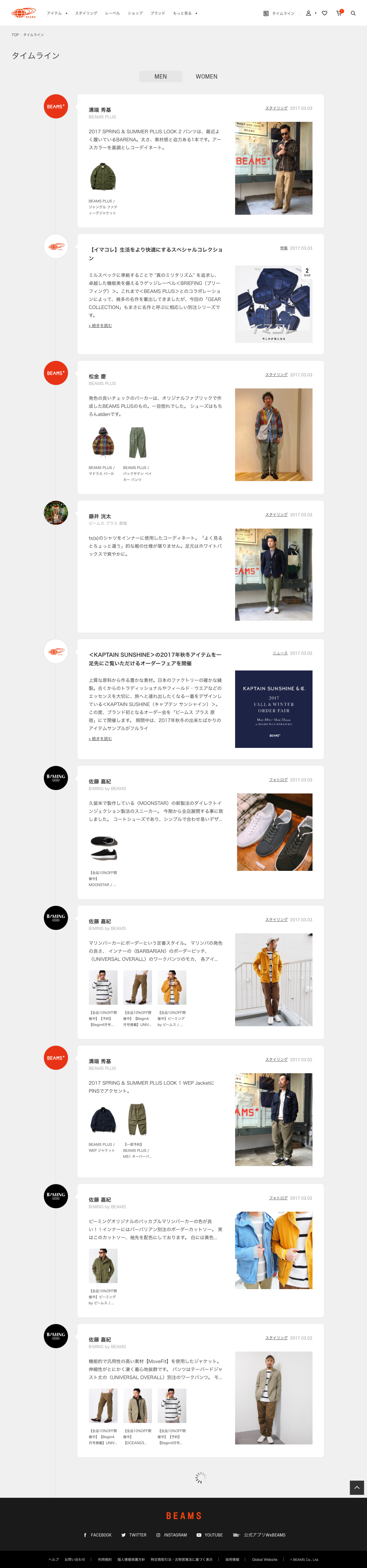 BEAMSのオフィシャルサイトをリニューアル、主に設計を担当しました。 オンラインストアとファッション・カルチャー発信のメディアを融合させたウェブサイトで、スタッフ発信の旬な情報も人気です。レーベルやスタッフをフォローすることで、自分の好みにあったタイムラインができあがり、スタイリング写真やおすすめのアイテム情報が流れてくるようになります。