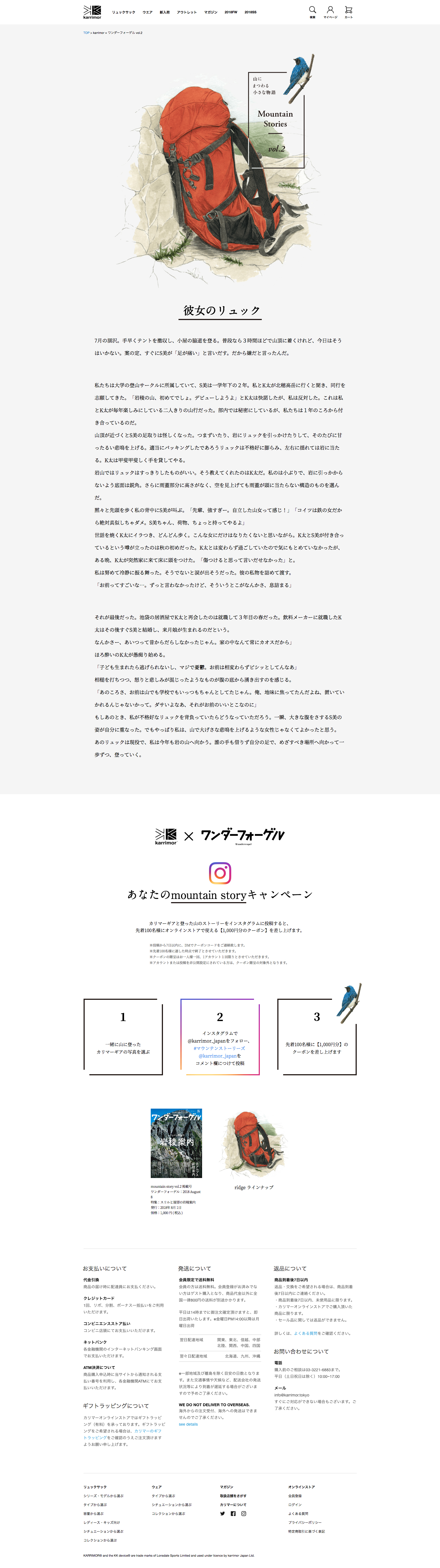 karrimorとワンダーフォーゲルがお送りする、山で起こったちいさなお話。TWOTONEはデザインを担当しました。 連載は雑誌ワンダーフォーゲルにて掲載されています。