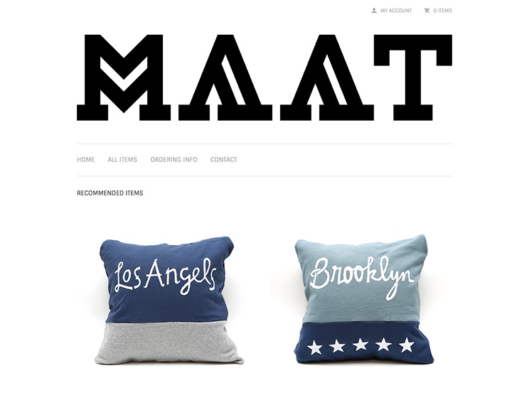 新ブランド「MAAT」のロゴをデザインしました。 MAATは、アメリカン60'sを感じるオリジナルデザインの生活雑貨を中心に、生活空間を彩るアイテムを産み出していくブランドです。ブランド立ち上げ第一弾のアイテムは、やさしいネイビーブルー系のクッションカバーを中心に。